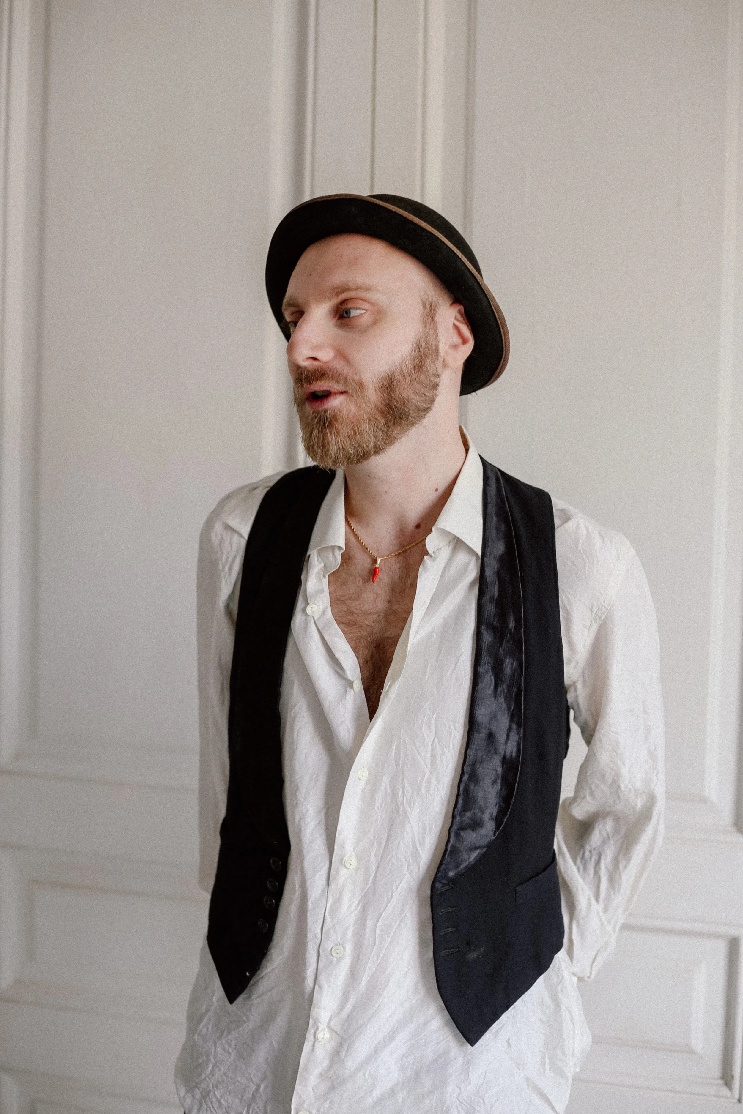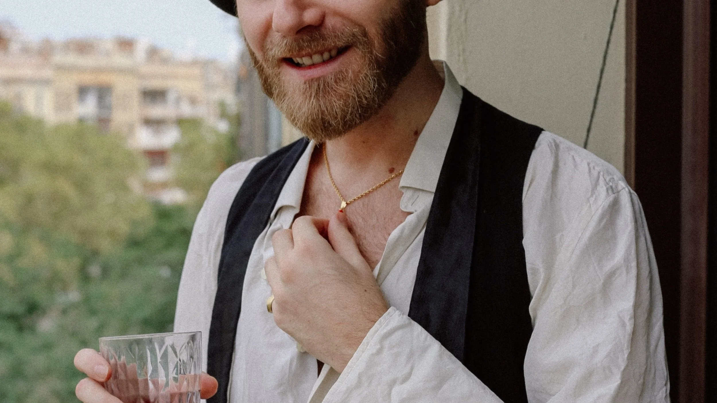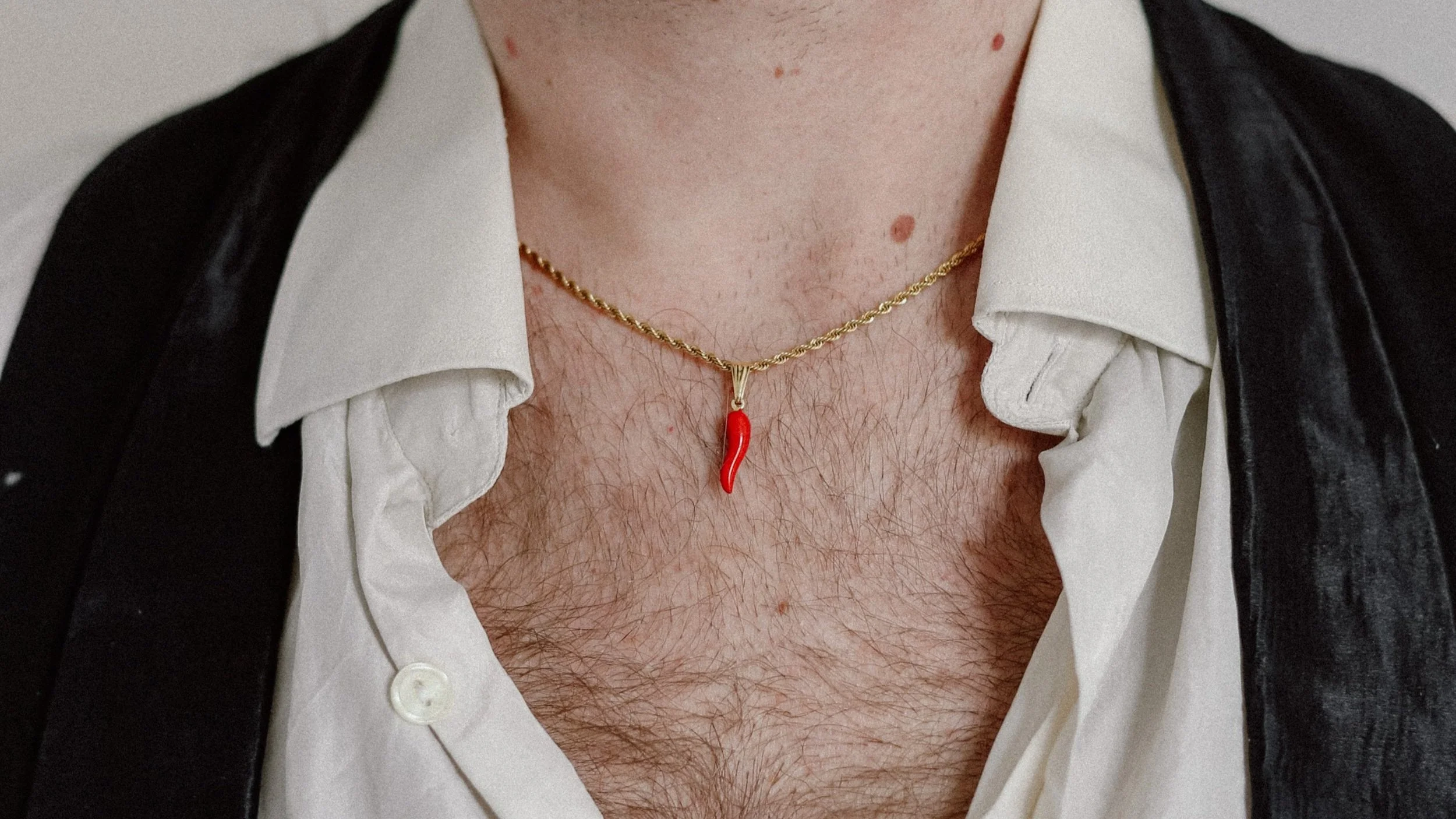 Francesco nació en Nápoles, Italia, aunque hace ya tantos años que vive en Barcelona, que también es local. De esos que conocen casi a todas las personas del barrio (y a media ciudad). Francesco combina su pasión por el mundo de la moda vintage con los conocimientos de sus estudios de música, creando eventos culturales y expandiendo su negocio de vinilos con historia y exclusivos. Confieso que llevaba más de dos años queriendo diseñar una pieza que representara parte de él, y poder entrevistarlo en Clothes with Stories x Eros Python. El collar Cornicello es elegante - y ciertamente picante, aunque no es un chili sinó que representa un cuerno rojo. La cadena de plata bañada de oro del collar, tiene presencia y por su forma de cuerda parecen raíces que crean una conexión entre esta pieza folklórica y la cultura de Francesco.